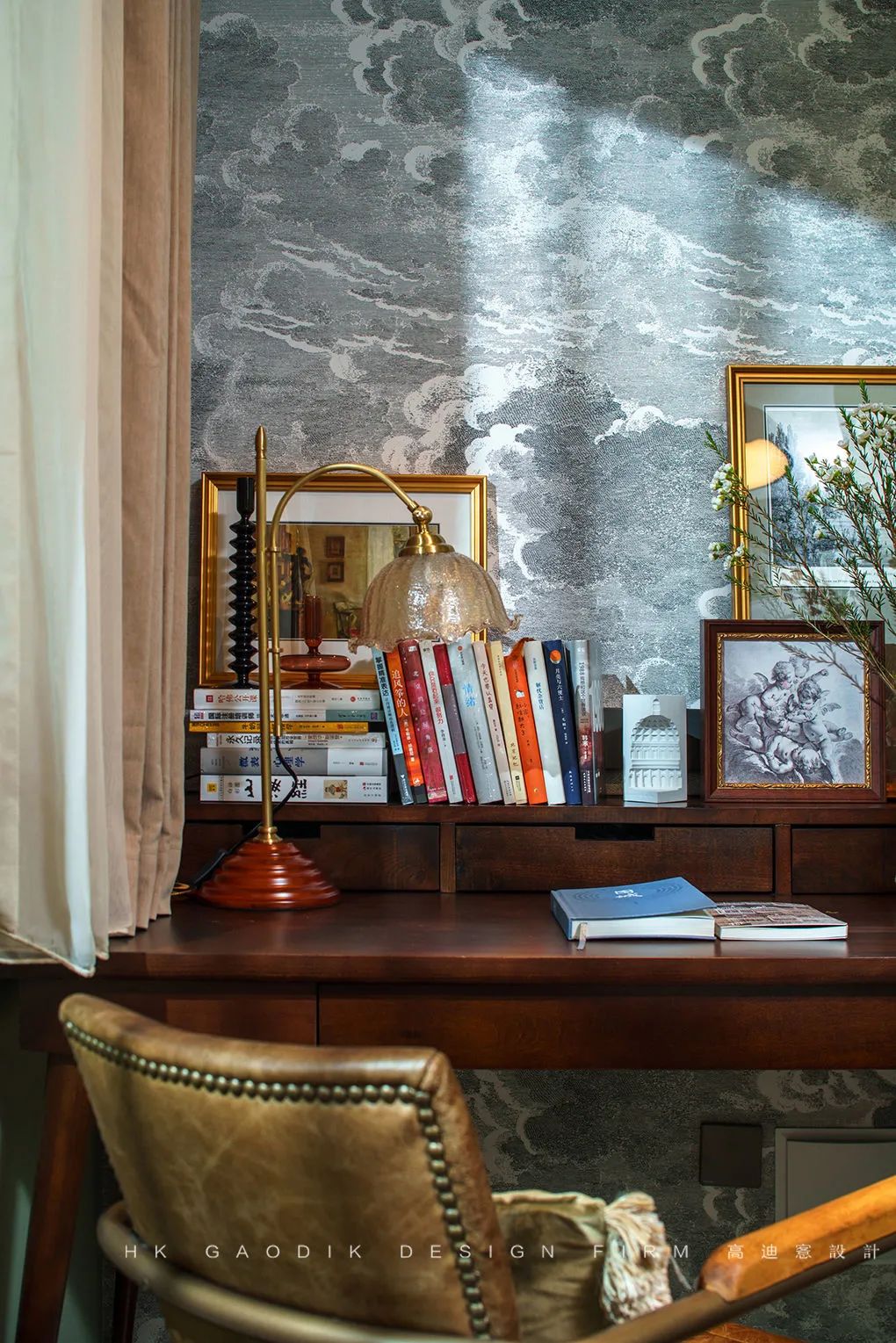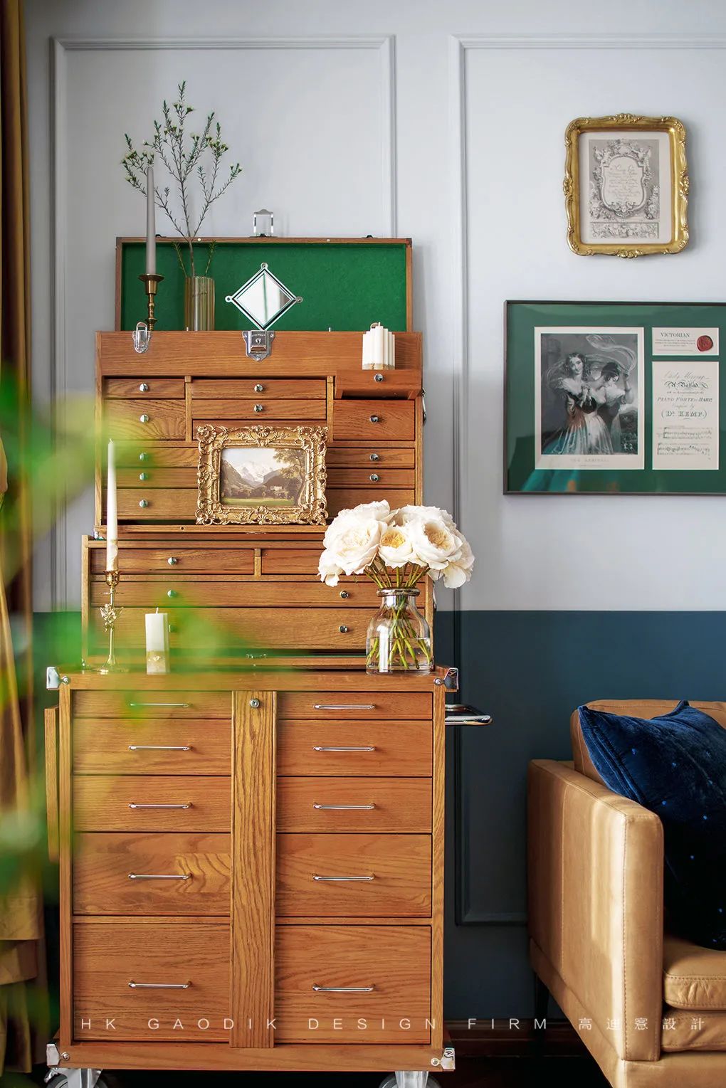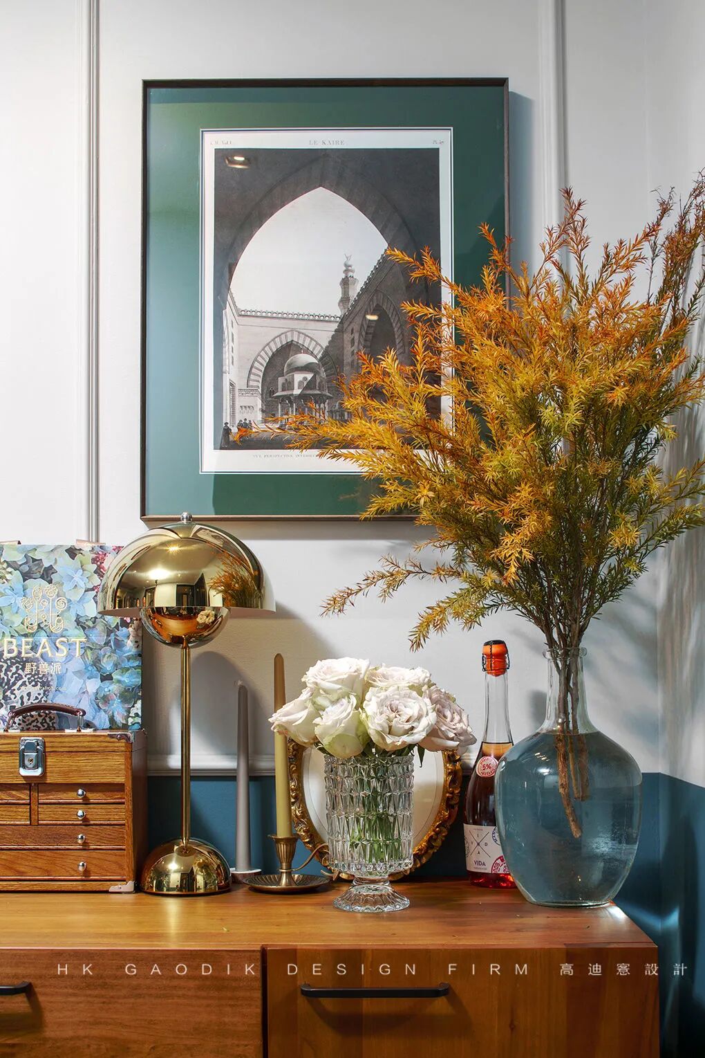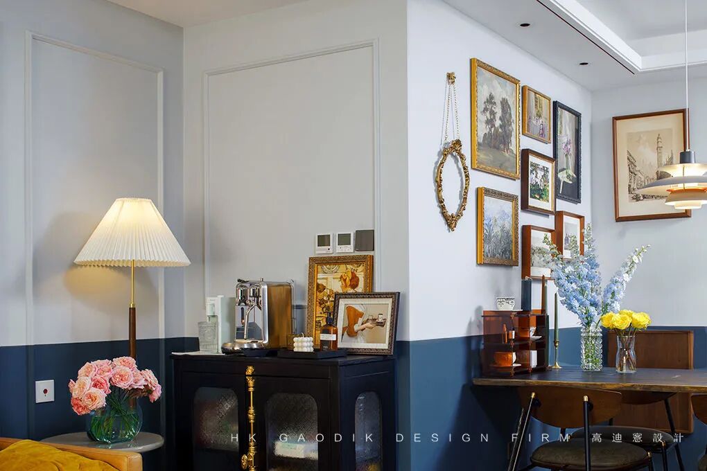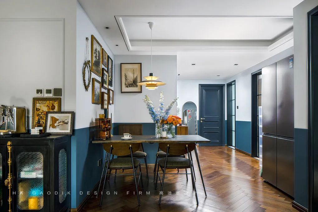 由手工艺工匠用的储物柜演变而来的这个装饰柜,足足等了好几个月才“落户”新家。更让人惊喜的是每天九十点的阳光总是悄然而至,带来一天的好心情。原先的白色木门统一更换成蓝色系门框与整体风格呼应,厨房、客卫则选用了长虹玻璃门,其独有的线条和通透感让空间更灵动轻松。复古的照片墙是本案的亮点,有繁复,有简约质朴,还有典雅的各式画框,错落有致,厚重和清新的组合,让整个餐厅区域既丰富又和谐。复古混搭的重中之重在于配饰的选择以及氛围的营造,精细到茶具、烛台、香薰都在发挥着微妙的平衡。