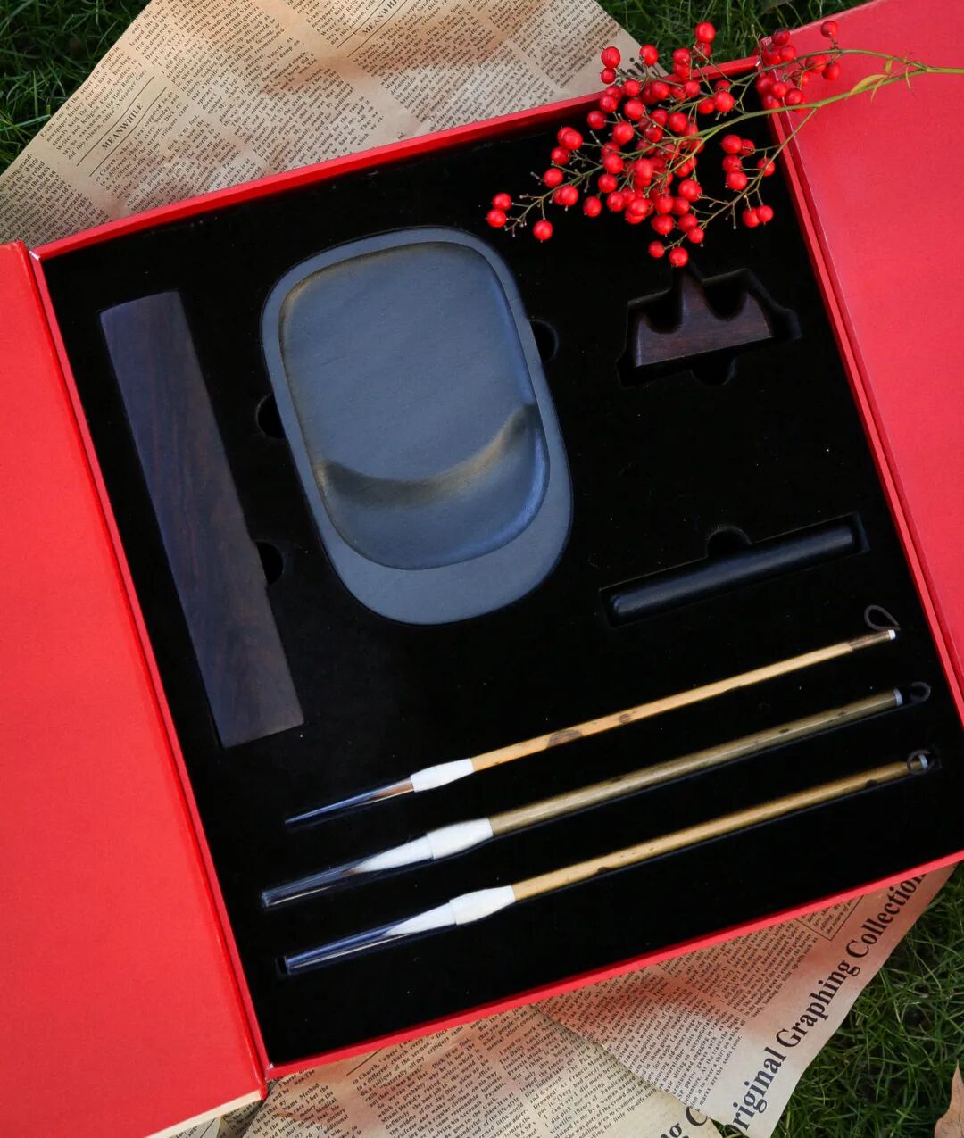 打开礼盒,就是我们为大家精心挑选的礼品了,其中笔和砚都大有来头。