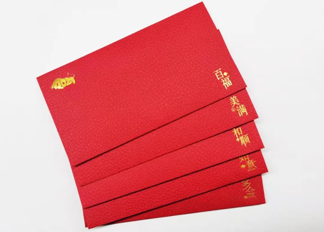 跟大家平常见到的红包有所不同,我们特别选用了带荔枝纹的纸张进行制作,抽开红包外盒,晃眼一看,会有些皮革质感,既简约又有格调。