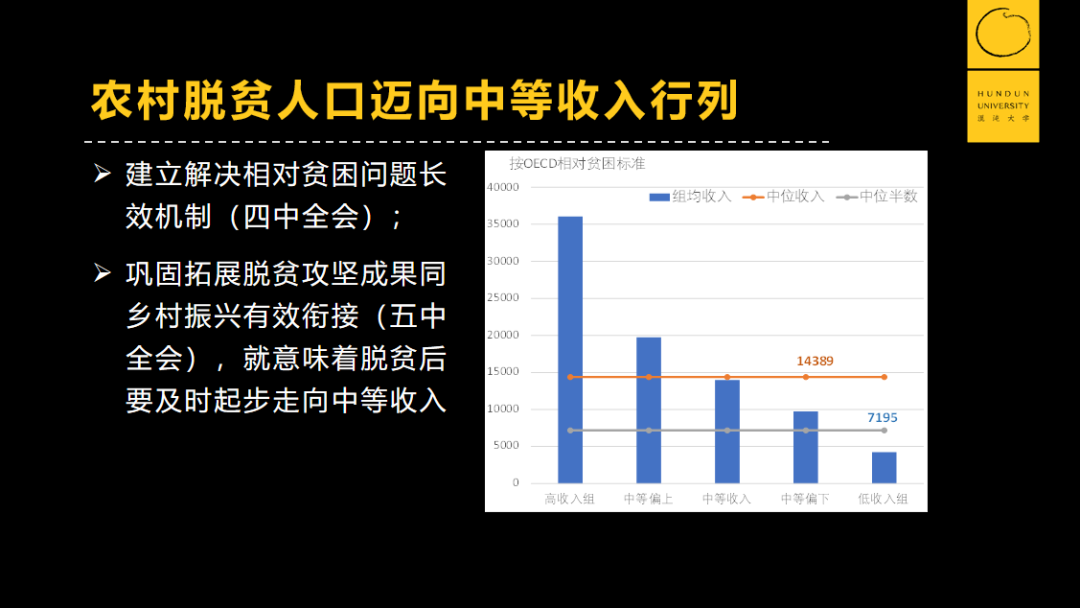按照这个标准,去年的农村人均可支配收入的中位数收入是14389元,那它的50%就是7195元,那么大家看,至少低收入组那20%的家庭只有4000多元,还远远没有达到这个水平。那也就是说,我们要以这些人群为对象,不断解决他们的相对贫困问题,不断向中等收入跨越。这就能保证我们居民收入的增长,消费的提高。