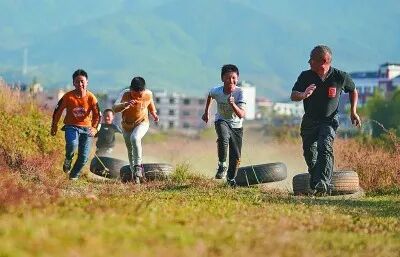 江西省萍乡市麻田中心学校,学生们在进行“轮胎赛跑”训练。新华社发