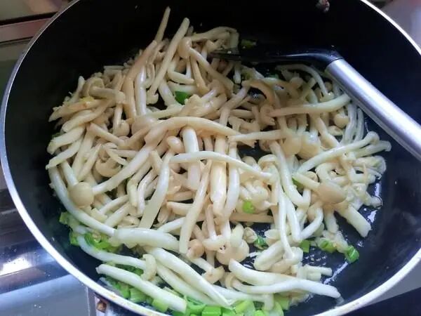 步骤4,白玉菇或者海鲜菇洗净,入油锅翻炒均匀。