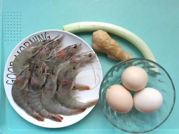 对虾 适量、鸡蛋 3个、白玉菇或海鲜菇 适量、精盐 1勺、水淀粉 1勺、食用油 适量、葱姜 适量