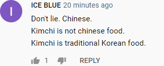 “别说谎了中国人。泡菜不是中国的食物。泡菜是韩国传统食物。“
