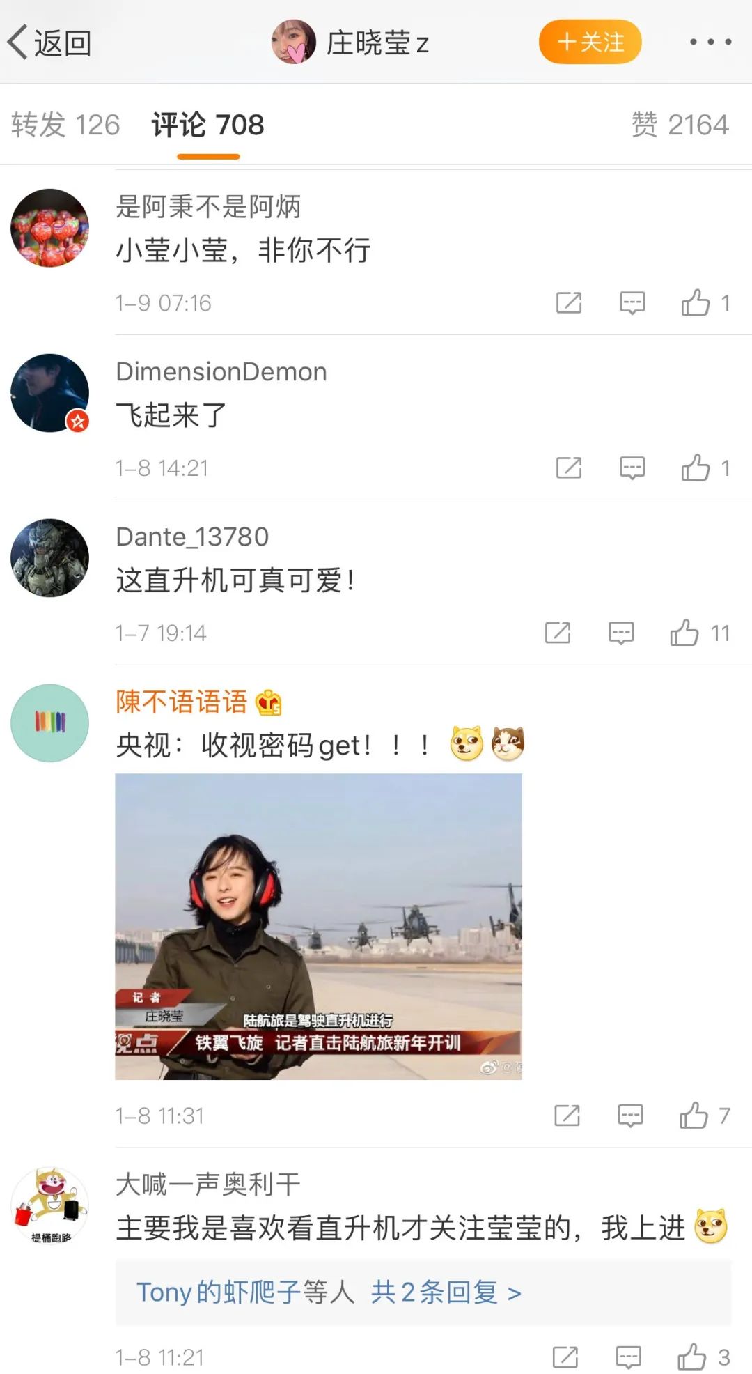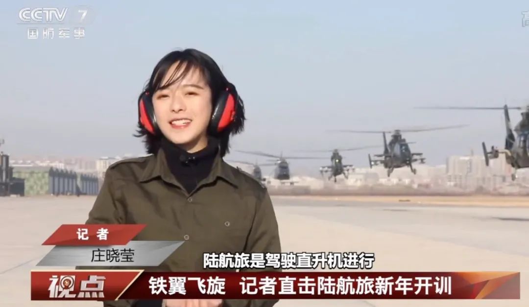 没想到的是,距离王冰冰出圈刚过两个月,又一位新鲜出炉的央视小花强势占据了观众视线,成了直男们眼中的新“初恋”。说到这里,许多人已经猜到了,外滩君今天要说的就是这两天在网上热度非常高的庄晓莹。作为央视军事频道记者,这位25岁妹子在镜头前的表现就是一个字——飒!在庄晓莹的脸上,能看出很多明星的轮廓,有人说她长得像张含韵、徐娇、万茜。刚被王冰冰打得方寸大乱的宅男们,这回又被庄晓莹迷住了,弹幕上屡屡飘过:但庄晓莹在镜头中呈现出来的专业状态,比“甜过初恋”的颜值更动人。1月7日晚,CCTV-7国防军事频道《国防科工》播出了新一期节目,被转到B站后意外火了,播放量很快超过了180万次。这期节目本身内容讲述的是华北某野战场的课目训练,展现了直升机协同作战等场景,这样的硬核军事内容,照理说不是大多数年轻人会感兴趣的。大家关注的焦点,是穿着军绿色制服、头戴巨大隔音耳罩的央视记者庄晓莹。这是一张陌生的面孔,但却在短短几秒内就能吸引观众注意。一是因为庄晓莹的面容的确漂亮,青春气息满溢;二是因为她在镜头前表现出来的状态,怎么说呢,实在是和这张脸反差太大。直升机停机坪的大风呼啸,把她的刘海卷得四处飞散,同时她还必须用高过飞机噪音的嗓门大声吼出解说词,喊到破音。但即便如此,这个小妮子没有露出半点怯色,全程脱稿,口齿清晰,表情、体态自如且坚定。坐上直升机上天后,她更是展现出了惊人的稳定状态,无论是飞机低空掠过树梢,还是强烈颠簸,她的神情都泰然自若,口述不停,条理清晰。更重要的是,不管周围风多大头发多乱、身处环境多惊险颠簸,庄晓莹都很“好看”,能靠气质镇住场。这个数架直升机从头顶掠过的镜头,尤为震撼。庄晓莹的热度传到了微博上,“央视收视密码”又一次被送上了热搜。她只有2000粉丝的微博账号一天里新增了近2万粉丝,翻了十倍,吓得她立刻开了“仅展示半年内微博”。庄晓莹来自福建永安东边的小镇槐南,1996年出生。她的本科在安徽师大学习汉语言文学,2021年以383分的成绩跨专业考取中国传媒大学新闻传播专业研究生。新闻传播是中传分数线最高的研究生专业。庄晓莹的英语考了86,考过研的都知道,这算是真学霸了。本科毕业前,庄晓莹就开始在人民日报实习,参与过全国两会报道,写稿、采访、运营新媒体甚至摄影都有着很高水准。2021年硕士毕业后,24岁的庄晓莹进入了央视军事频道当编辑,在台前能出镜报道,在幕后也是编导全能。随着军事频道全新改版,相貌出挑又业务过硬的她,很快进入了军迷观众的视野。在最近因为直升机报道走红破圈后,庄晓莹以往的许多出镜画面都被网友找了出来,反复观摩。介绍军用降落伞是如何生产时,她还自己进入车间上手操作,认真得有些可爱。在庄晓莹的微博上,能够看出来平时也是一个爱美的普通女孩,会发一些生活琐碎,跑步游泳、正在看什么电影、家里养的猫等等。