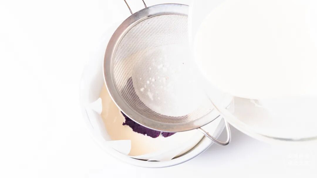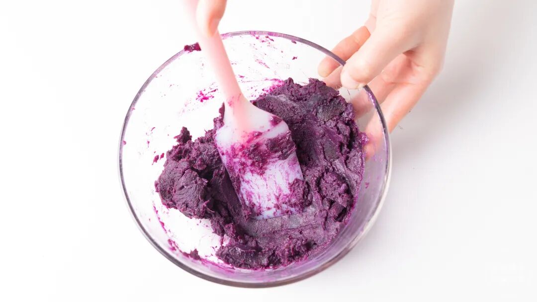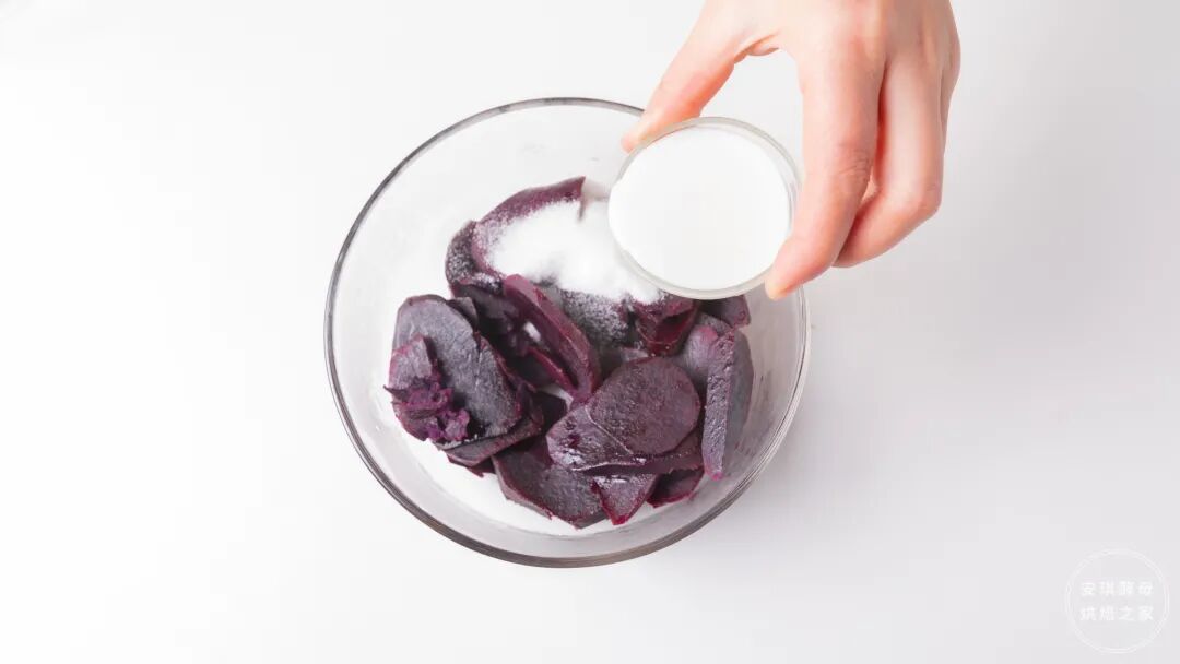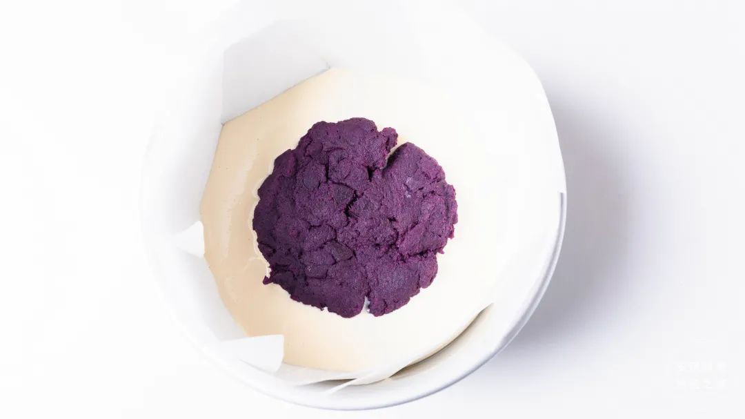 ②蒸熟的紫薯加40g牛奶和20g糖,捣成泥,按压成圆形片状备用。③剩余的牛奶和糖,玉米油和鸡蛋倒入碗中,加糯米粉和泡打粉,拌匀。