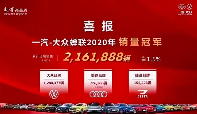 据一汽-大众发布年度销量数据,2020年累计终端销售新车达2161888辆(含奥迪进口车),同比增长1.5%,是国内唯一一家产销均突破200万辆的乘用车企业,蝉联乘用车销量榜冠军。其中,大众品牌终端销售1280377辆;奥迪品牌终端销售726288辆(含进口车);捷达品牌终端销售155223辆。