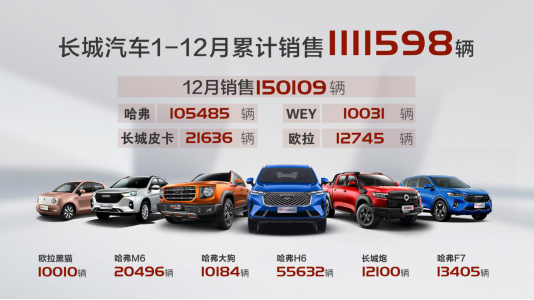 具体车型来看,不出意外,“国民神车”哈弗H6年销量达376864辆,连续8年夺得SUV年度销量冠军,12月销售55632辆,同比增长33.4%,累计91个月稳居SUV月度销量冠军;哈弗大狗上市三个月即月销破万,12月销售10184辆,显现爆款潜质;长城炮全年销量突破11万辆,坐稳皮卡市场销量冠军宝座;欧拉“猫系三剑客”中,主力热销车型欧拉黑猫12月销售破万,达10010辆,助力欧拉品牌稳居新能源行业第一阵营;自坦克300上市以来,助推小众的越野SUV市场热度高涨,订单持续劲增,更是形成了别具一格的“坦克现象”。
