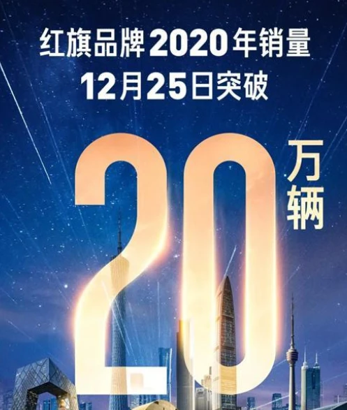 一汽红旗是今年第一家公开销量的车企。据官方数据显示,红旗在2020年全年累计售出新车209197辆,同比增长超过100%,占据一汽集团乘用车总销量近六成。