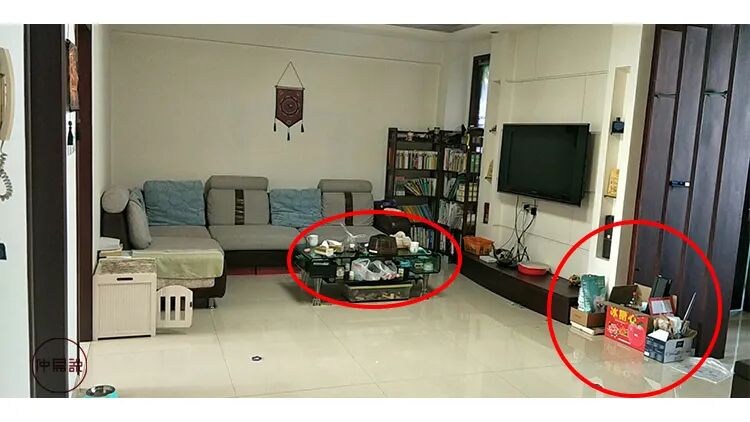 茶几上以及电视机右下方的杂物堆积,杂物较多且显突兀,一眼望去过于杂乱。