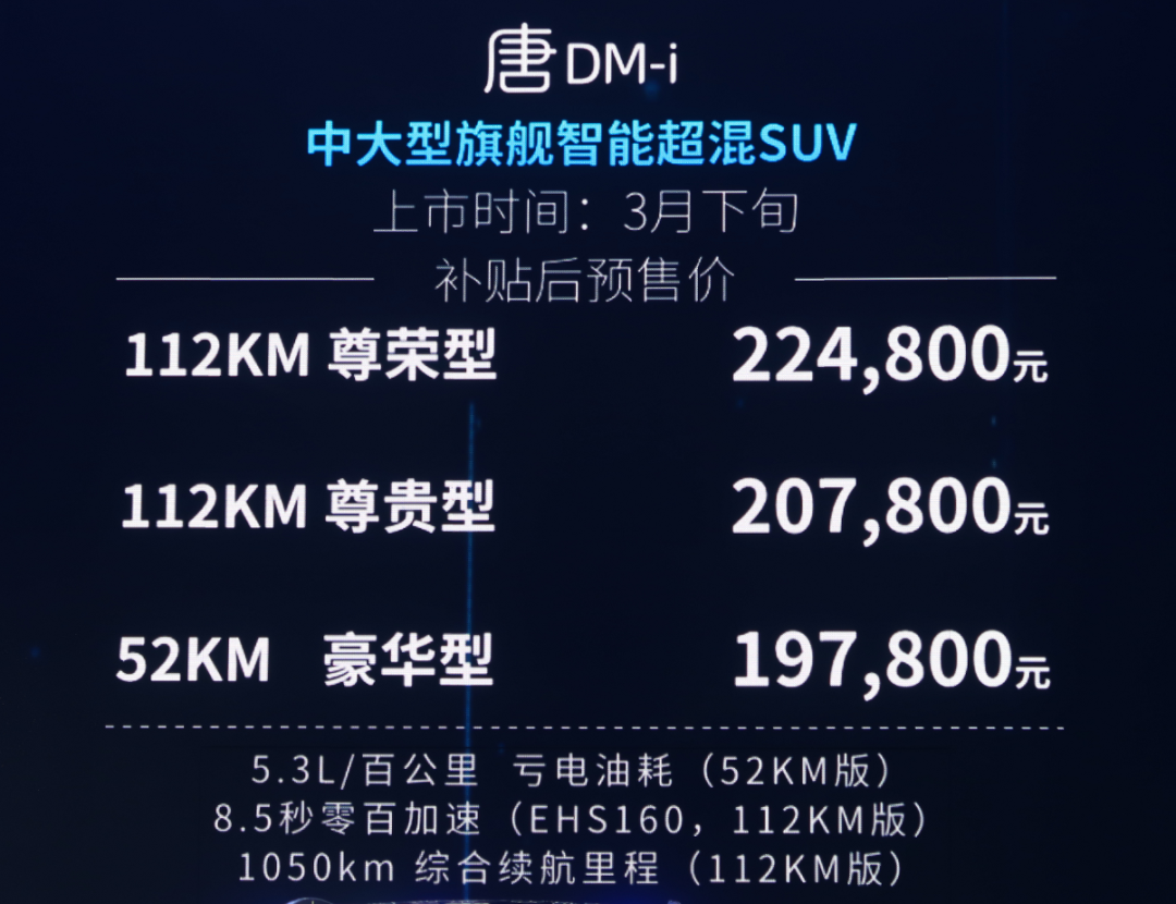 唐DM-i的预售价为19.78-22.48万,相比唐DM下降了非常多,这样的价格相信可以进一步提升唐车型的销量。