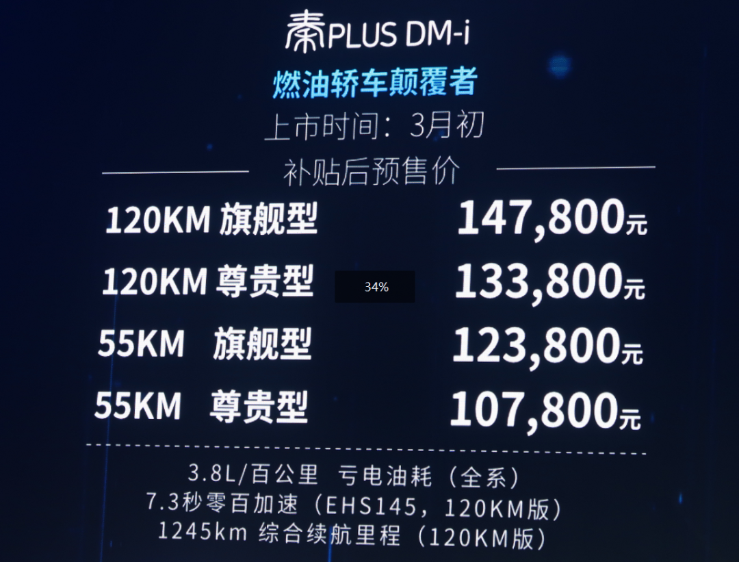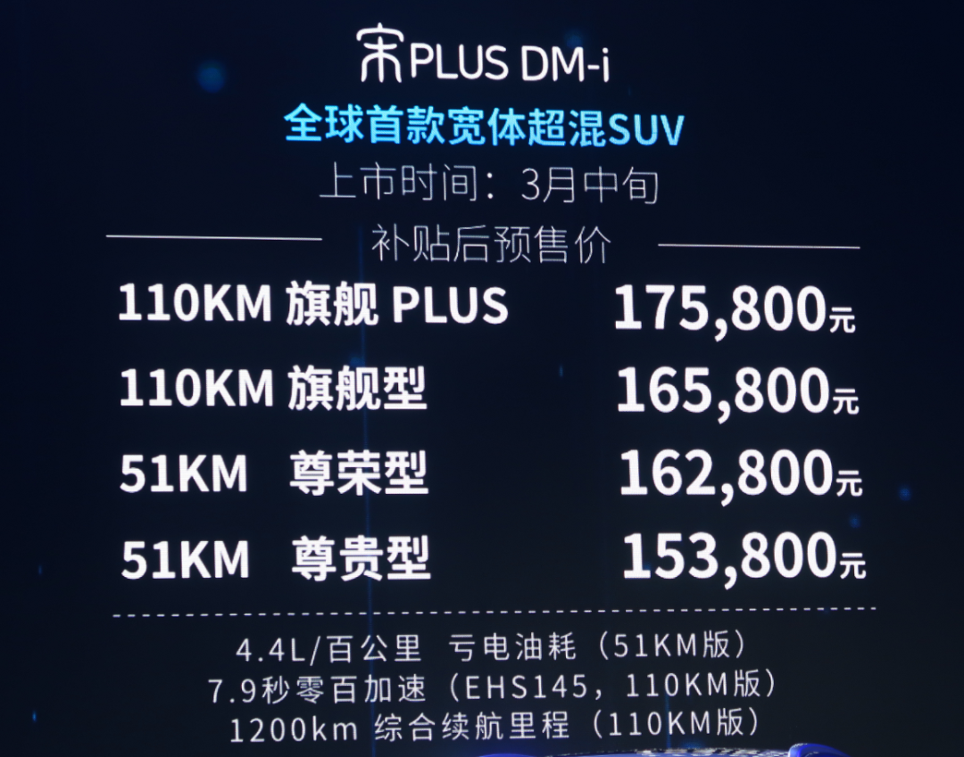 宋PLUS DM-i的预售价为15.38-17.58万,新车将于今年3月中旬上市,这也是宋PLUS首次推出的插电混合动力车型。