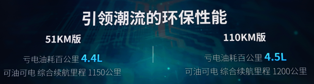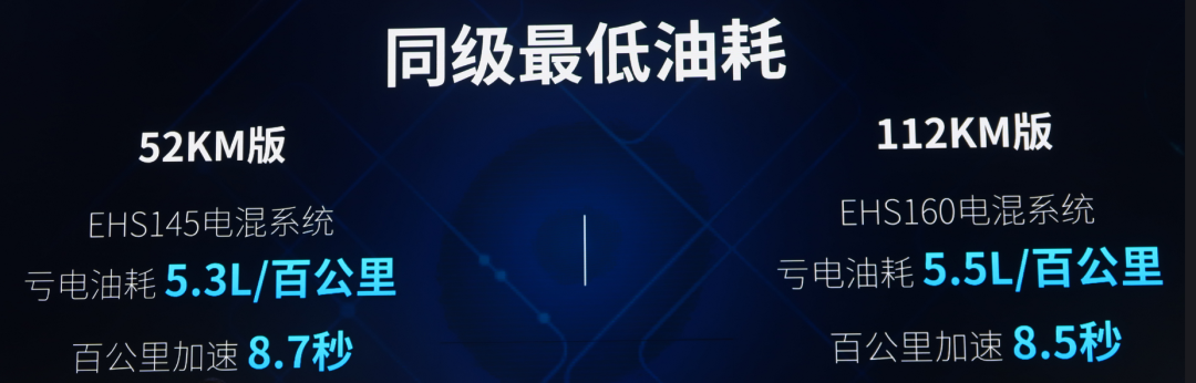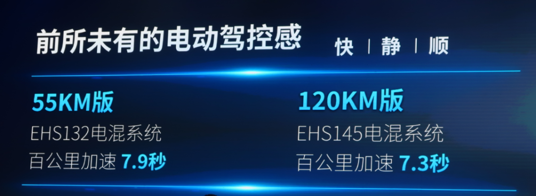 52km纯电续航版使用使用最大功率为145kW,峰值扭矩325N·m的电机,百公里加速8.7秒,综合续航里程达到1010km,亏电油耗5.3L/100km;112km纯电续航版本使用最大功率为160kW,峰值扭矩325N·m的电机,百公里加速8.5秒,综合续航里程达到1050km,亏电油耗5.5L/100km