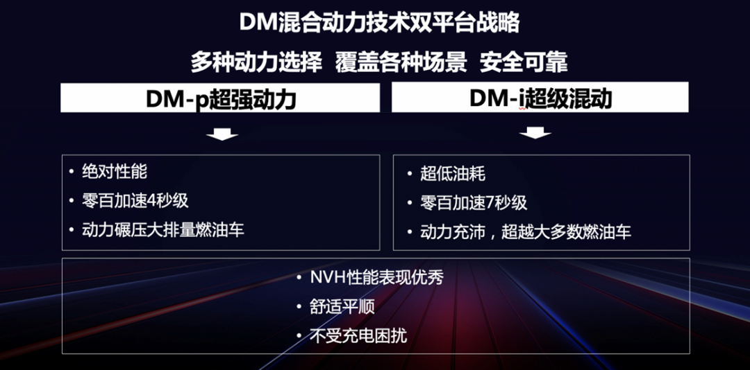 在比亚迪的DM(即双模)插电混合动力系统中是有细分的,包含DM-p和DM-i。DM-p是强劲版,“p”即powerful,动力更强,满足追求更好驾驶体验的用户,而实际上,而在DM-i发布之前,比亚迪的主要DM车型就是DM-p,主打超强的动力性能。