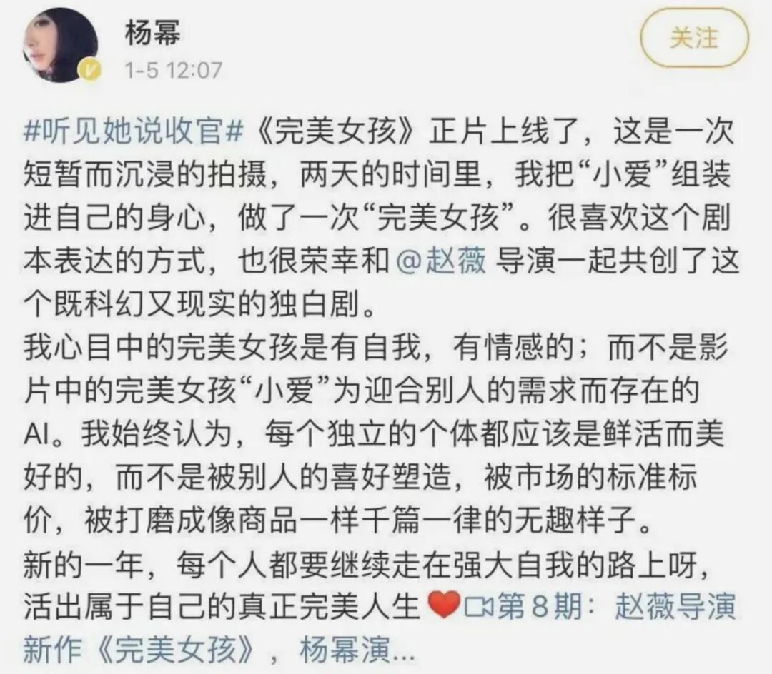 不久前,由赵薇导演的女性独白剧《听见她说》落幕了,收官之作是由杨幂主演的《完美女孩》。