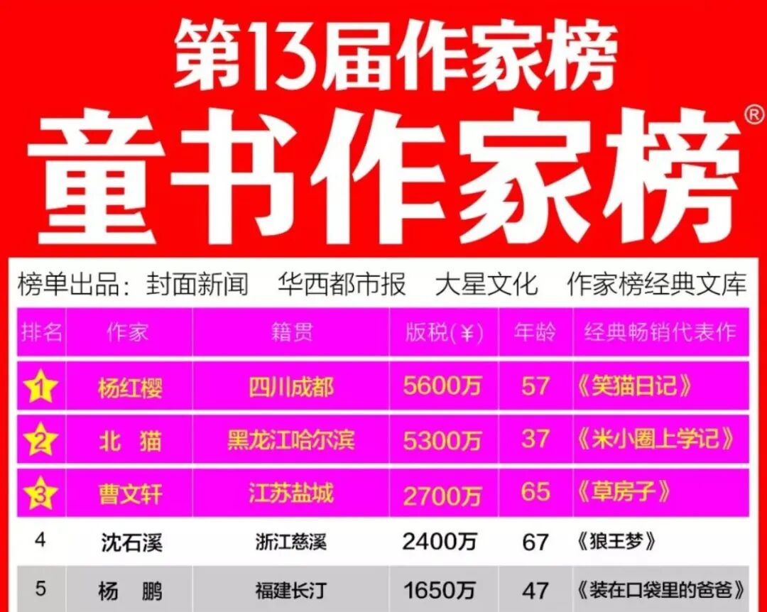 三年后,《童话大王》的销量达到了惊人的100万册每月。在长达25年的时间里,郑渊洁是该月刊的唯一撰稿人,作品超2000万字,杂志总印数逾亿册。90后中的一大批人是在皮皮鲁、鲁西西以及舒克和贝塔的陪伴下长大的。而那位嘲他“不知天高地厚,能坚持两年名字就倒着写”的教授也该兑现承诺了。第13届作家榜首次单列了童书作家榜,说白了,就是富豪榜。有人在微博拱火问郑:“天天说自己销量高,连名字都没有,你敢回应吗”。