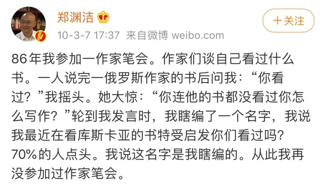 郑渊洁摇头,这作家大惊:“你连他的书都没看过你怎么写作?”轮到郑发言,他问:“我最近在看库斯卡亚的书,你们看过吗?”会上七成的人点头,结果郑渊洁话锋一转,这名字是我瞎编的。