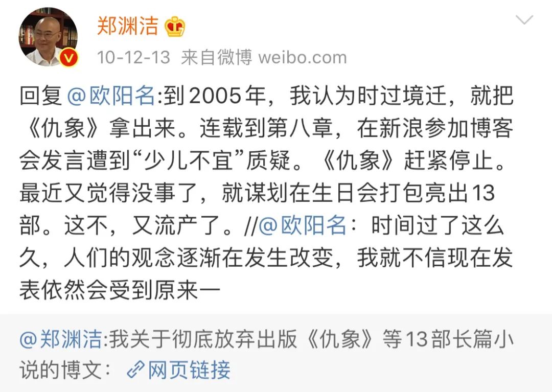 郑渊洁一直强调青少年性教育非常必要,“早早跟他们解释清了,孩子们知道了是怎么回事,反而就不会好奇了”。但,有家长举报郑渊洁毒害下一代,《今日说法》点名批评他少儿不宜。下半身不能写,后来连“结婚”二字也不能写。他自省,立下遗嘱:《仇象》等13部作品等他去世百年后再出版。
