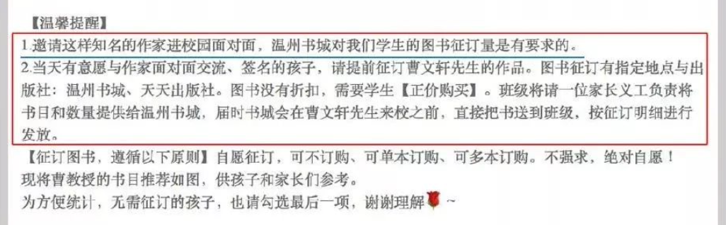 比如在某小学的通告中,虽写着购书自愿,但只有订量达到要求,才能邀请到知名作家,且只有购书的学生才有面对面交流签名的机会。而童书的批发价皆在四五折左右,却仍要求学生正价购买,这中间的回扣差价又去了哪?